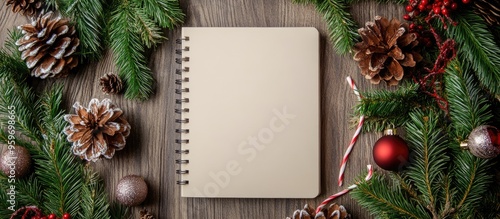 Obraz premium Christmas arrangement featuring a blank notebook with space for copy