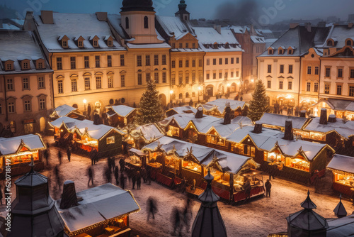 © VisualProduction, Obraz premium Christmas at old town hall square. Christmas market and shopping concept. Fairy lights and snow. Generative AI