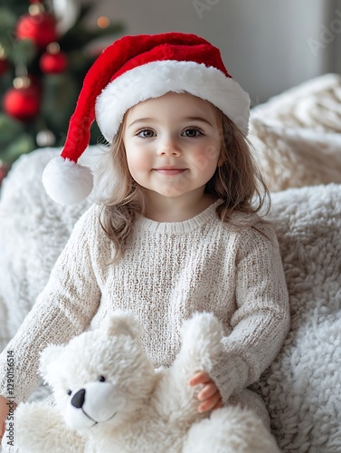 © Ngaji, Obraz premium Christmas Baby Girl with Teddy Bear