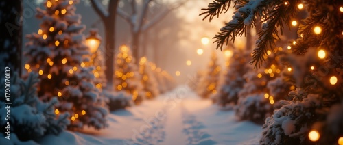 © Oleg Zaharov, Naklejka premium Christmas background banner with a winter alley among snow-covered fir trees with christmas lights in soft garland light