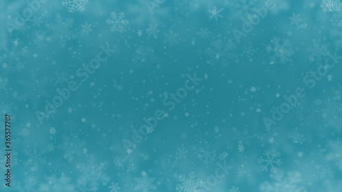 Fototapeta premium Christmas background of snowflakes of different shapes, sizes, blur and transparency in light blue colors