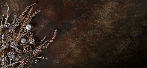 © Arina B, Naklejka premium Christmas background, the composition of their cones and dried flowers on a dark brown background. Abstract composition, idea, decor.