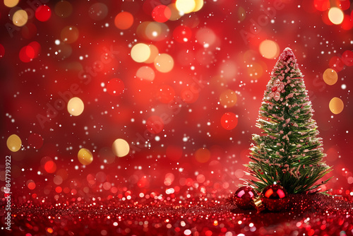 Naklejka premium Christmas background with a xmas tree, sparkle bokeh lights on red canvas....