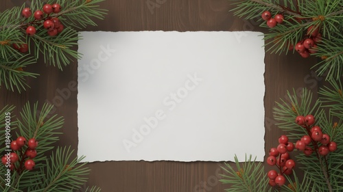 © HabibulAlamKhan, Obraz premium Christmas background with blank paper for text and pine branches with red berries on wood