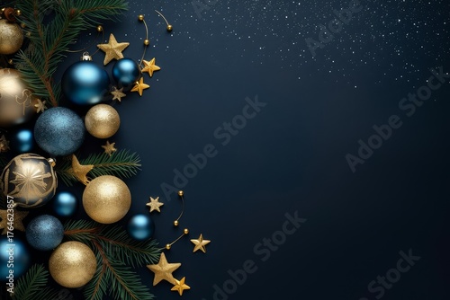 Fototapeta premium Christmas background with blue and gold ornaments and fir branches decorating a dark blue surface