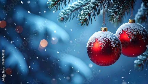 © ImageSine, Fototapeta premium christmas background with christmas tree and balls In Winter On Fir Branches