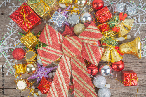 Fototapeta premium Christmas background with decorations bow and gift boxes on woo