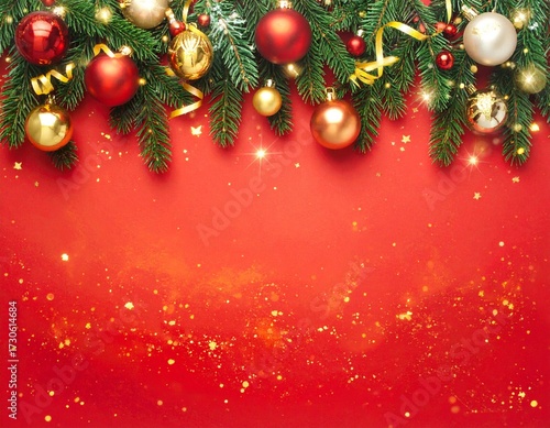 Naklejka premium Christmas Background with Fir Branches, Ornaments, and Candy Canes on Red
