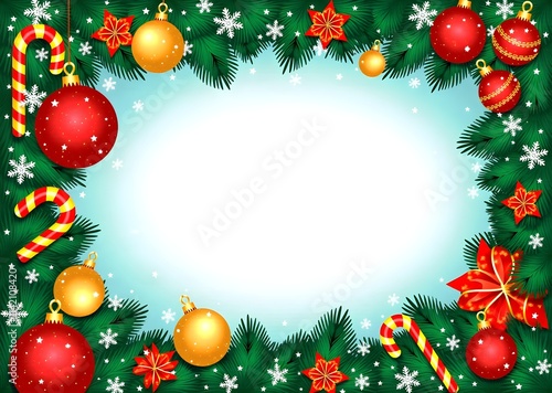 Naklejka premium Christmas background with garland, ornaments, stars, and red and gold glitter...