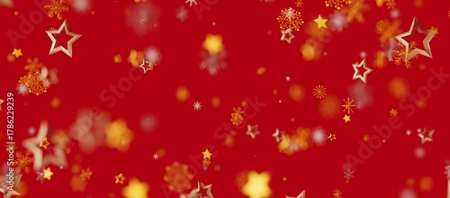 Obraz premium Christmas background with golden stars and snowflakes on red. Perfect for holiday design, greetings, or promotions. Festive and celebratory.