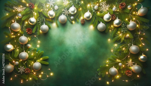 Fototapeta premium Christmas background with green fir tree branches, silver balls and garland...