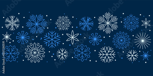 © dlyastokiv, Naklejka premium Christmas background with snowflakes and stars, banner with snowflakes border, pattern for Christmas greetings, New Year holidays design