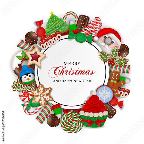 © Angelica, Obraz premium Christmas background with sweets. christmas round frame with candies and cakes