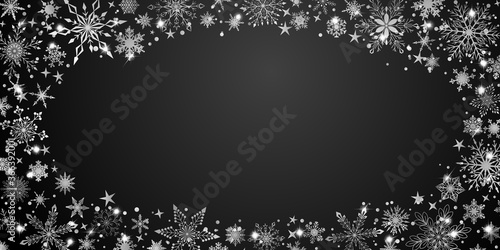 Fototapeta premium Christmas background with various complex big and small snowflakes, white on black, arranged in a ellipse