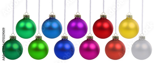 Fototapeta premium Christmas balls many baubles banner decoration ornaments hanging isolated on...