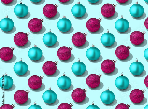 © New Africa, Obraz premium Christmas balls on turquoise background. Pattern design