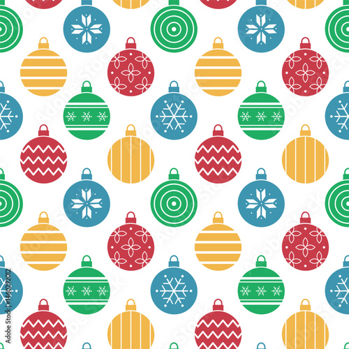 © irynaalex, Fototapeta premium Christmas Balls Ornaments Pattern. Seamless Colorful Geometric Print with Christmas Ornament. Trendy Flat Style Background. Can be used for Packaging, Cover. Vector in Red, Blue, Green, Yellow, White
