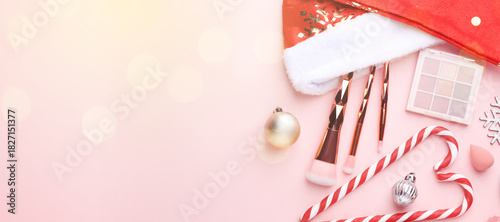 Fototapeta premium Christmas banner with makeup products, Santa hat and festive balls on pink...