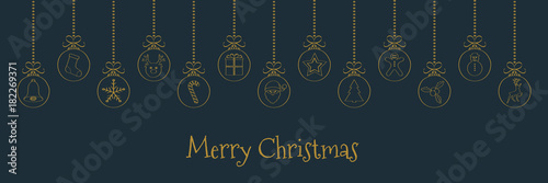 © Karolina Madej, Naklejka premium Christmas banner with wishes and hanging balls with hand drawn decorations. Vector.