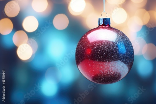 Fototapeta premium Christmas bauble on bokeh background. New Year greeting card. Created with...