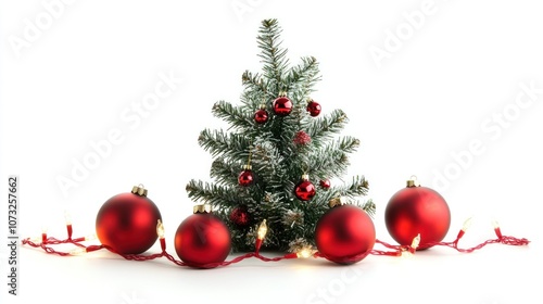 Naklejka premium Christmas baubles and fairy lights wrapped around a small Christmas tree on a simple white background