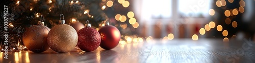 Fototapeta premium Christmas baubles on wooden surface with festive lights