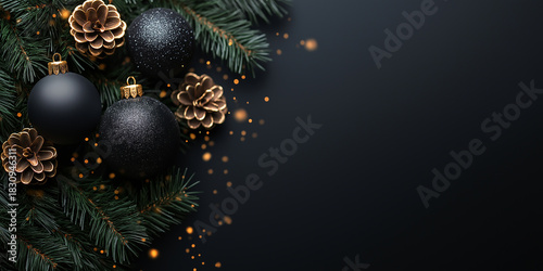 © elenabdesign, Naklejka premium Christmas black decoration and spruce tree on black background. Merry Christmas and Happy Holidays greeting card, frame, banner. New Year. Noel. Winter festive xmas theme.