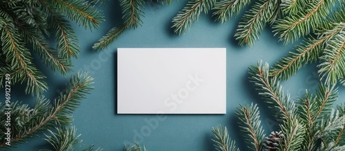 Fototapeta premium Christmas blank greeting card mock up scene A creative arrangement featuring Christmas tree branches and a paper card note Flat lay Nature New Year theme. with copy space image