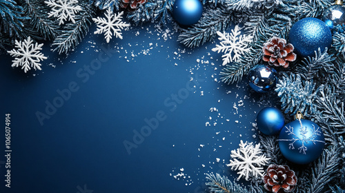 Naklejka premium Christmas border composition with blue and silver ornaments and frosted fir branches on a classic blue background