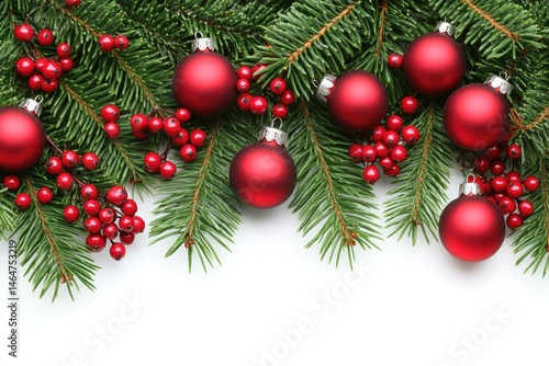 © old, Fototapeta premium Christmas border with red ornaments and berries on evergreen branches