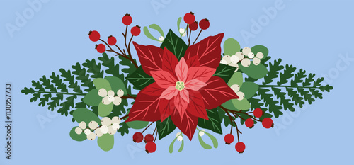 Fototapeta premium Christmas botanical composition with poinsettia, fern, snowberry. Decorative and festive floral arrangement. Hand drawn vector illustration for design holiday decor, decoration new year, greeting card