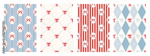 © accogliente, Fototapeta premium Christmas bows and ribbons seamless pattern background set. Vintage xmas packaging textures. Cute decorative frames. Coquette holiday print. Wrapping paper. Striped backdrop. Vector illustration
