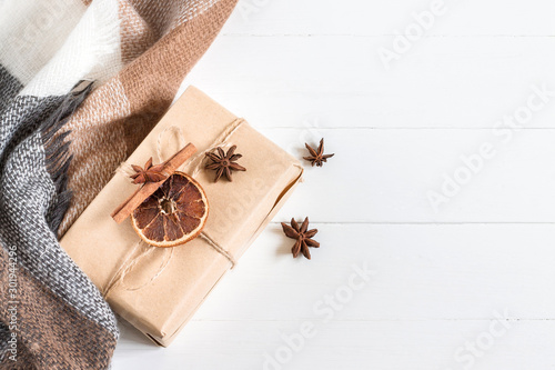 © Evgenia, Obraz premium Christmas box with a gift in craft paper, a scarf, a plaid, cones, anise on a white wooden background in a rustic style top view, copy space. New Year and Christmas concept