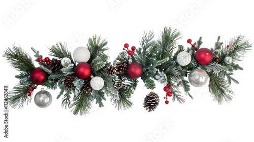 © 云琛 赵, Fototapeta premium Christmas Branches Border with Christmas Decorations on White Background, Festive Embellishments for Holiday Cheer and Decor.