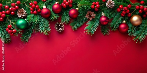 © Diana, Fototapeta premium Christmas branches with red and green baubles, berries, and pinecones on a red background. Perfect for festive designs with copy space for text or branding.