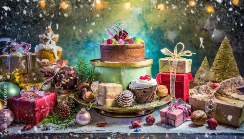 © Visual Vibes, Fototapeta premium christmas cake with candles and decorations