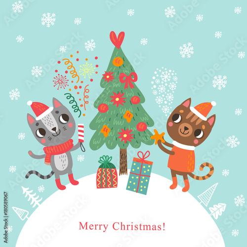 © Guz Anna, Fototapeta premium Christmas card. Christmas tree and cats