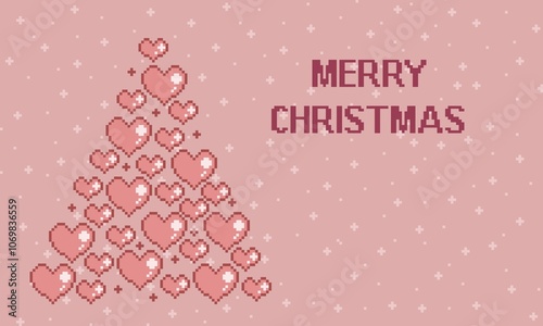 Naklejka premium Christmas card design in Pixel Art, with artistic love pattern christmas tree, pink background and merry christmas greetings and copy space. can be used for wallpaper, template card and background.