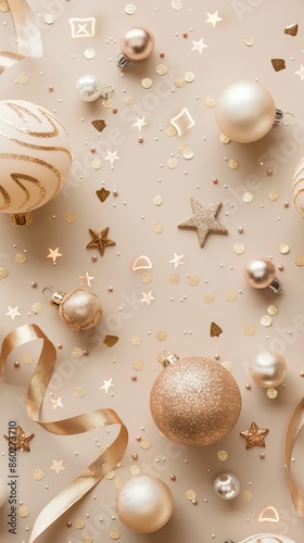 © Master old, Fototapeta premium Christmas card mockup on pastel beige background with balls and stars decoration. Flat lay, top view. Minimal style