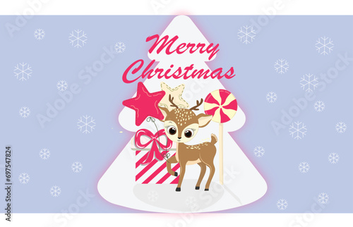 © Ahmed, Fototapeta premium christmas card with a cute deer with tree christmas and merry christmas with gift, balloons and lollipop candy christmas vector illustration cartoon