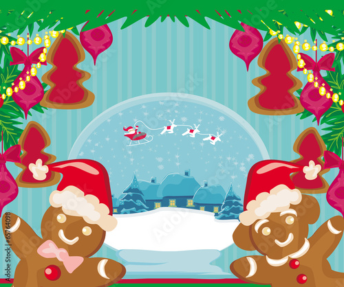 Fototapeta premium christmas card with a ginger-bread and Santa Claus flying over c