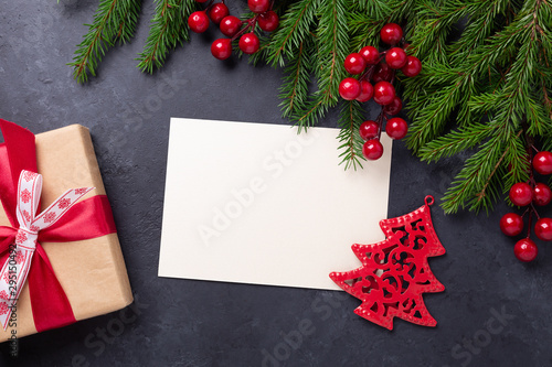 Fototapeta premium Christmas card with paper, gift box and fir tree branch on stone background....
