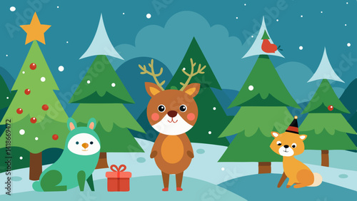 Fototapeta premium Christmas Cartoon Forest Background with Playful Animals
