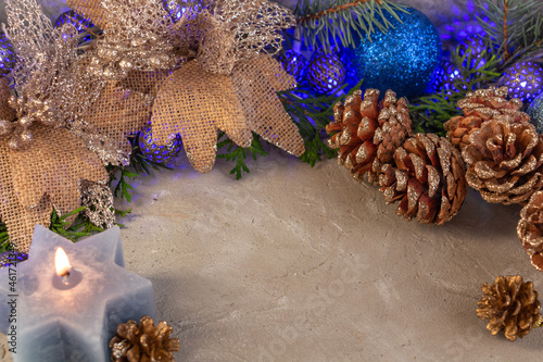 © Tam Sam, Fototapeta premium christmas composition in silver blue color, blue garland, spruce branches, candle on gray background, copy space