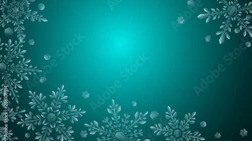 Fototapeta premium Christmas composition of large complex transparent snowflakes in light blue...