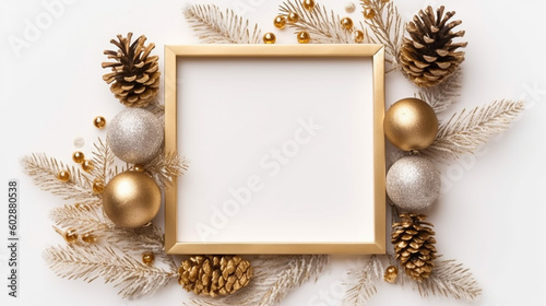 © Lalaland, Fototapeta premium Christmas composition. Photo frame, golden decorations, fir tree branches on white background. Christmas, winter, new year concept. Flat lay, top view, copy space