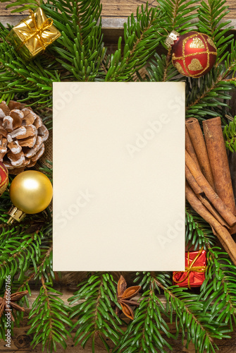 Obraz premium Christmas Composition with a blank card, fir branches and decorations on wooden table