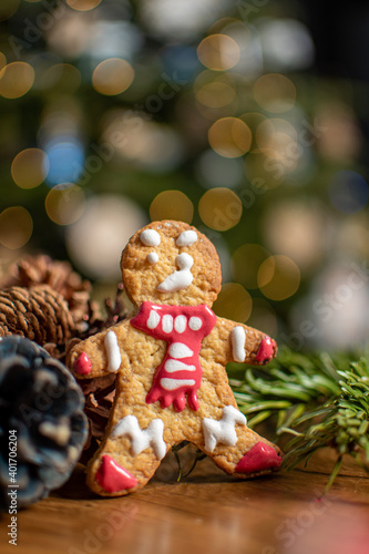 © Ion, Obraz premium Christmas cookie man with tree bokeh effect