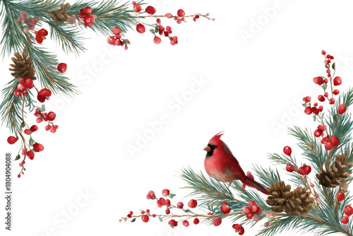 © Prazis Images, Naklejka premium Christmas Corner Border with Cardinal Bird and Pine Branches Watercolor