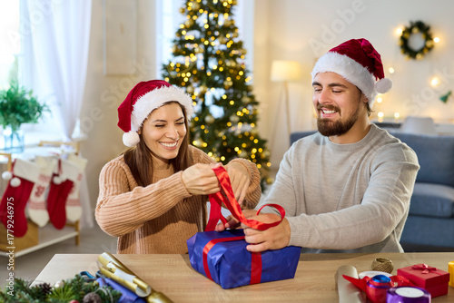 Obraz premium Christmas couple wrapping a gift with ribbon. At home in santa hats, they tie a bow on a colorful box beside festive tree sharing smiles. Holiday celebration and preparation concept.